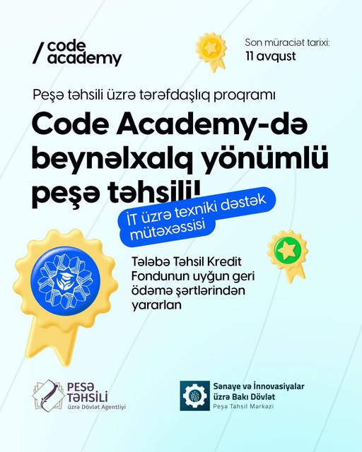 Code Academy və Peşə Təhsili üzrə Dövlət Agentliyinin əməkdaşlığı ilə keçirilən beynəlxalq yönümlü peşə təhsili proqramı çərçivəsində “İT üzrə Texniki Dəstək Mütəxəssisi” ixtisasına qeydiyyat başladı.